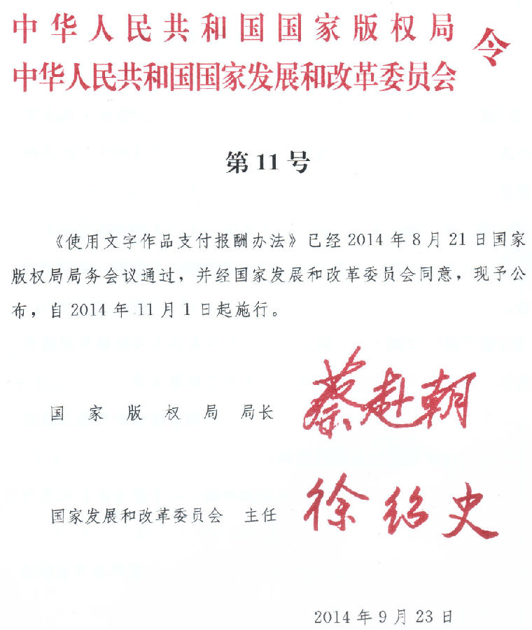 使用文字作品支付報(bào)酬辦法 第一條 為保護(hù)文字作品著作權(quán)人的著作權(quán),規(guī)范使用文字作品的行為,促進(jìn)文字作品的創(chuàng)作與傳播,根據(jù)《中華人民共和國(guó)著作權(quán)法》及相關(guān)行政法規(guī),制定本辦法。 第二條 除法律、行政法規(guī)另有規(guī)定外,使用文字作品支付報(bào)酬由當(dāng)事人約定;當(dāng)事人沒(méi)有約定或者約定不明的,適用本辦法。 第三條 以紙介質(zhì)出版方式使用文字作品支付報(bào)酬可以選擇版稅、基本稿酬加印數(shù)稿酬或者一次性付酬等方式。 版稅,是指使用者以圖書定價(jià)×實(shí)際銷售數(shù)或者印數(shù)×版稅率的方式向著作權(quán)人支付的報(bào)酬。 基本稿酬,是指使用者按作品的字?jǐn)?shù),以千字為單位向著作權(quán)人支付的報(bào)酬。 印數(shù)稿酬,是指使用者根據(jù)圖書的印數(shù),以千冊(cè)為單位按基本稿酬的一定比例向著作權(quán)人支付的報(bào)酬。 一次性付酬,是指使用者根據(jù)作品的質(zhì)量、篇幅、作者的知名度、影響力以及使用方式、使用范圍和授權(quán)期限等因素,一次性向著作權(quán)人支付的報(bào)酬。 第四條 版稅率標(biāo)準(zhǔn)和計(jì)算方法: (一)原創(chuàng)作品:3%—10% (二)演繹作品:1%—7% 采用版稅方式支付報(bào)酬的,著作權(quán)人可以與使用者在合同中約定,在交付作品時(shí)或者簽訂合同時(shí)由使用者向著作權(quán)人預(yù)付首次實(shí)際印數(shù)或者最低保底發(fā)行數(shù)的版稅。 首次出版發(fā)行數(shù)不足千冊(cè)的,按千冊(cè)支付版稅,但在下次結(jié)算版稅時(shí)對(duì)已經(jīng)支付版稅部分不再重復(fù)支付。 第五條 基本稿酬標(biāo)準(zhǔn)和計(jì)算方法: (一)原創(chuàng)作品:每千字80-300元,注釋部分參照該標(biāo)準(zhǔn)執(zhí)行。 (二)演繹作品: 1.改編:每千字20-100元 2.匯編:每千字10-20元 3.翻譯:每千字50-200元 支付基本稿酬以千字為單位,不足千字部分按千字計(jì)算。 支付報(bào)酬的字?jǐn)?shù)按實(shí)有正文計(jì)算,即以排印的版面每行字?jǐn)?shù)乘以全部實(shí)有的行數(shù)計(jì)算。占行題目或者末尾排不足一行的,按一行計(jì)算。 詩(shī)詞每十行按一千字計(jì)算,作品不足十行的按十行計(jì)算。 辭書類作品按雙欄排版的版面折合的字?jǐn)?shù)計(jì)算。 第六條 印數(shù)稿酬標(biāo)準(zhǔn)和計(jì)算方法: 每印一千冊(cè),按基本稿酬的1%支付。不足一千冊(cè)的,按一千冊(cè)計(jì)算。 作品重印時(shí)只支付印數(shù)稿酬,不再支付基本稿酬。 采用基本稿酬加印數(shù)稿酬的付酬方式的,著作權(quán)人可以與使用者在合同中約定,在交付作品時(shí)由使用者支付基本稿酬的30%-50%。除非合同另有約定,作品一經(jīng)使用,使用者應(yīng)當(dāng)在6個(gè)月內(nèi)付清全部報(bào)酬。作品重印的,應(yīng)在重印后6個(gè)月內(nèi)付清印數(shù)稿酬。 第七條 一次性付酬的,可以參照本辦法第五條規(guī)定的基本稿酬標(biāo)準(zhǔn)及其計(jì)算方法。 第八條 使用演繹作品,除合同另有約定或者原作品已進(jìn)入公有領(lǐng)域外,使用者還應(yīng)當(dāng)取得原作品著作權(quán)人的許可并支付報(bào)酬。 第九條 使用者未與著作權(quán)人簽訂書面合同,或者簽訂了書面合同但未約定付酬方式和標(biāo)準(zhǔn),與著作權(quán)人發(fā)生爭(zhēng)議的,應(yīng)當(dāng)按本辦法第四條、第五條規(guī)定的付酬標(biāo)準(zhǔn)的上限分別計(jì)算報(bào)酬,以較高者向著作權(quán)人支付,并不得以出版物抵作報(bào)酬。 第十條 著作權(quán)人許可使用者通過(guò)轉(zhuǎn)授權(quán)方式在境外出版作品,但對(duì)支付報(bào)酬沒(méi)有約定或約定不明的,使用者應(yīng)當(dāng)將所得報(bào)酬扣除合理成本后的70%支付給著作權(quán)人。 第十一條 報(bào)刊刊載作品只適用一次性付酬方式。 第十二條 報(bào)刊刊載未發(fā)表的作品,除合同另有約定外,應(yīng)當(dāng)自刊載后1個(gè)月內(nèi)按每千字不低于100元的標(biāo)準(zhǔn)向著作權(quán)人支付報(bào)酬。 報(bào)刊刊載未發(fā)表的作品,不足五百字的按千字作半計(jì)算;超過(guò)五百字不足千字的按千字計(jì)算。 第十三條 報(bào)刊依照《中華人民共和國(guó)著作權(quán)法》的相關(guān)規(guī)定轉(zhuǎn)載、摘編其他報(bào)刊已發(fā)表的作品,應(yīng)當(dāng)自報(bào)刊出版之日起2個(gè)月內(nèi),按每千字100元的付酬標(biāo)準(zhǔn)向著作權(quán)人支付報(bào)酬,不足五百字的按千字作半計(jì)算,超過(guò)五百字不足千字的按千字計(jì)算。 報(bào)刊出版者未按前款規(guī)定向著作權(quán)人支付報(bào)酬的,應(yīng)當(dāng)將報(bào)酬連同郵資以及轉(zhuǎn)載、摘編作品的有關(guān)情況送交中國(guó)文字著作權(quán)協(xié)會(huì)代為收轉(zhuǎn)。中國(guó)文字著作權(quán)協(xié)會(huì)收到相關(guān)報(bào)酬后,應(yīng)當(dāng)按相關(guān)規(guī)定及時(shí)向著作權(quán)人轉(zhuǎn)付,并編制報(bào)酬收轉(zhuǎn)記錄。 報(bào)刊出版者按前款規(guī)定將相關(guān)報(bào)酬轉(zhuǎn)交給中國(guó)文字著作權(quán)協(xié)會(huì)后,對(duì)著作權(quán)人不再承擔(dān)支付報(bào)酬的義務(wù)。 第十四條 以