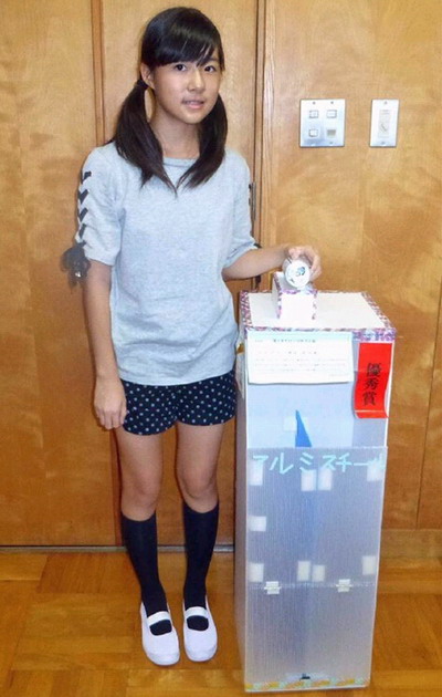 這名小學(xué)生名為神谷明日香,她設(shè)計的垃圾箱高約90厘米,呈長方體,用塑料板制作。內(nèi)部設(shè)有隔間,分別盛放鐵制易拉罐、鋁制易拉罐。