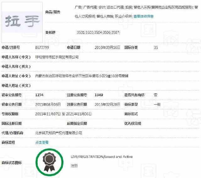 北京拉手網(wǎng)絡(luò)技術(shù)有限公司成立于2009年,次年成立拉手網(wǎng),網(wǎng)站建立之后便開(kāi)始使用“拉手”、“l(fā)ashou”標(biāo)識(shí)用于經(jīng)營(yíng)。但是根據(jù)國(guó)家商標(biāo)局?jǐn)?shù)據(jù)顯示,雖然拉手網(wǎng)注冊(cè)了540件相關(guān)商標(biāo),純粹“拉手”兩字的商標(biāo)最早卻是在別人手上。